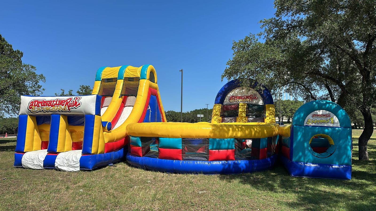 Our inflatable combo rentals from Jump N Slide Texas can make your celebration even more exciting. These inflatables incorporate a variety of thrilling activities with the best aspects of moonwalks. Imagine trying to evade pop-up hurdles, conquering thrilling climbs and slides, playing friendly basketball, and even having toddler-appropriate playgrounds for our smallest explorers.
