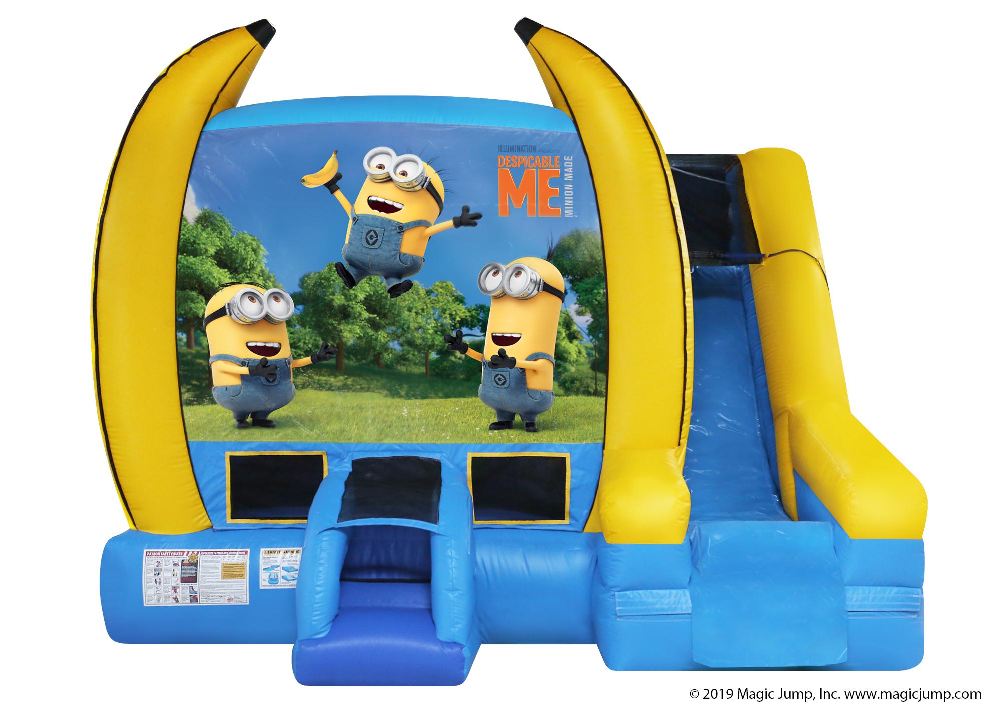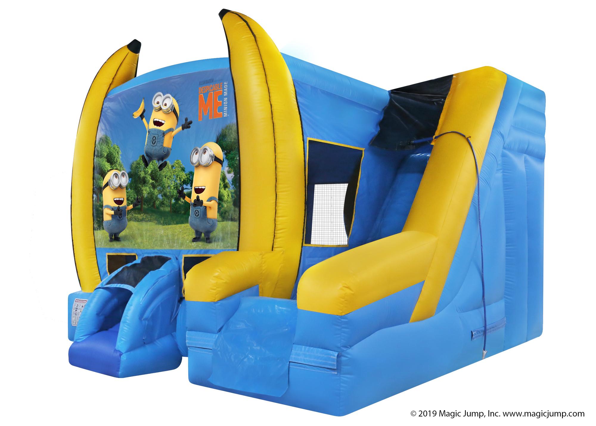 This Wet or Dry combo features six different inflatable activities: bouncing area, basketball hoop, inflated push-through, obstacle pop-ups, a wall climber, a wet or dry slide, and a removable pool/landing for wet use.