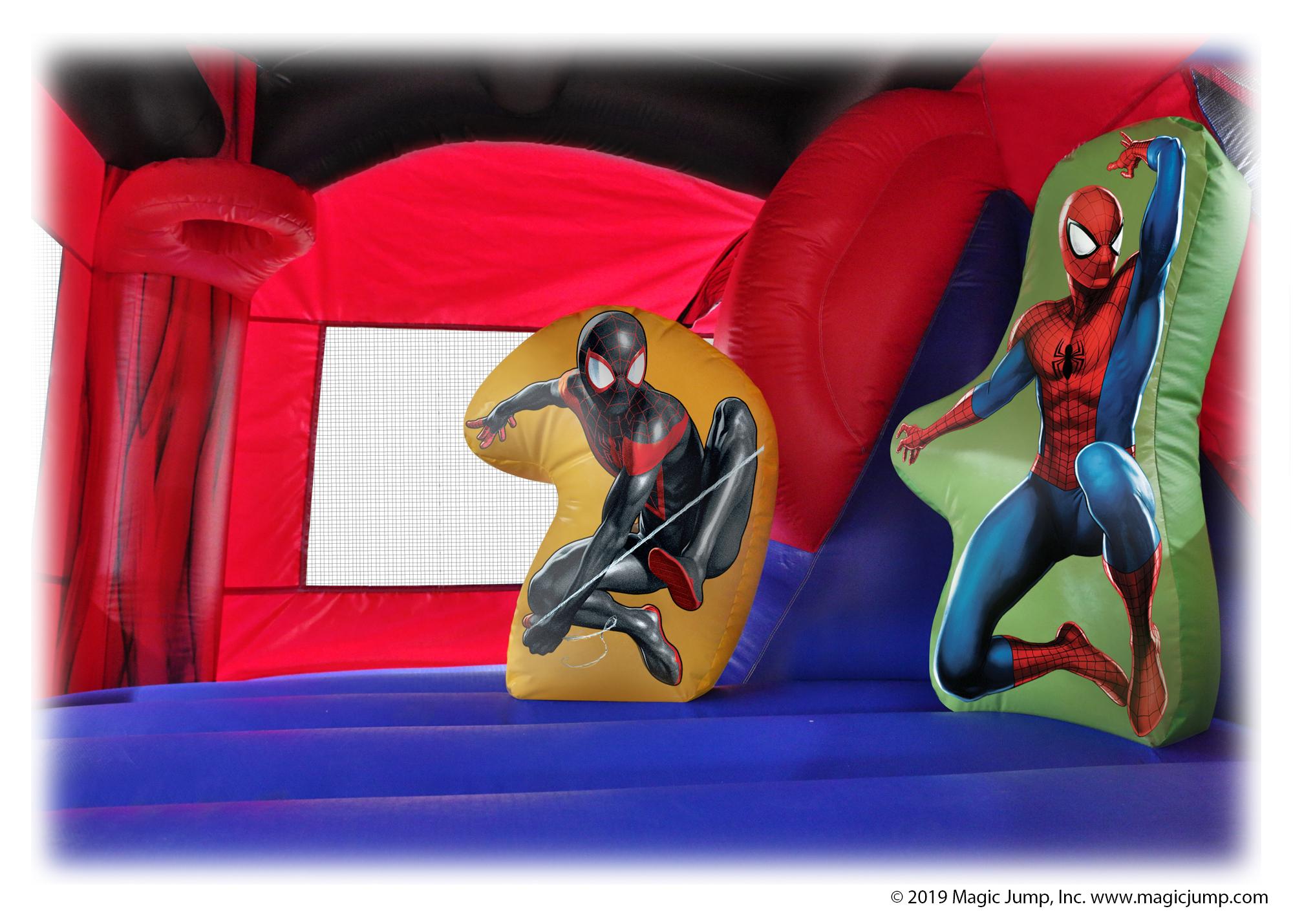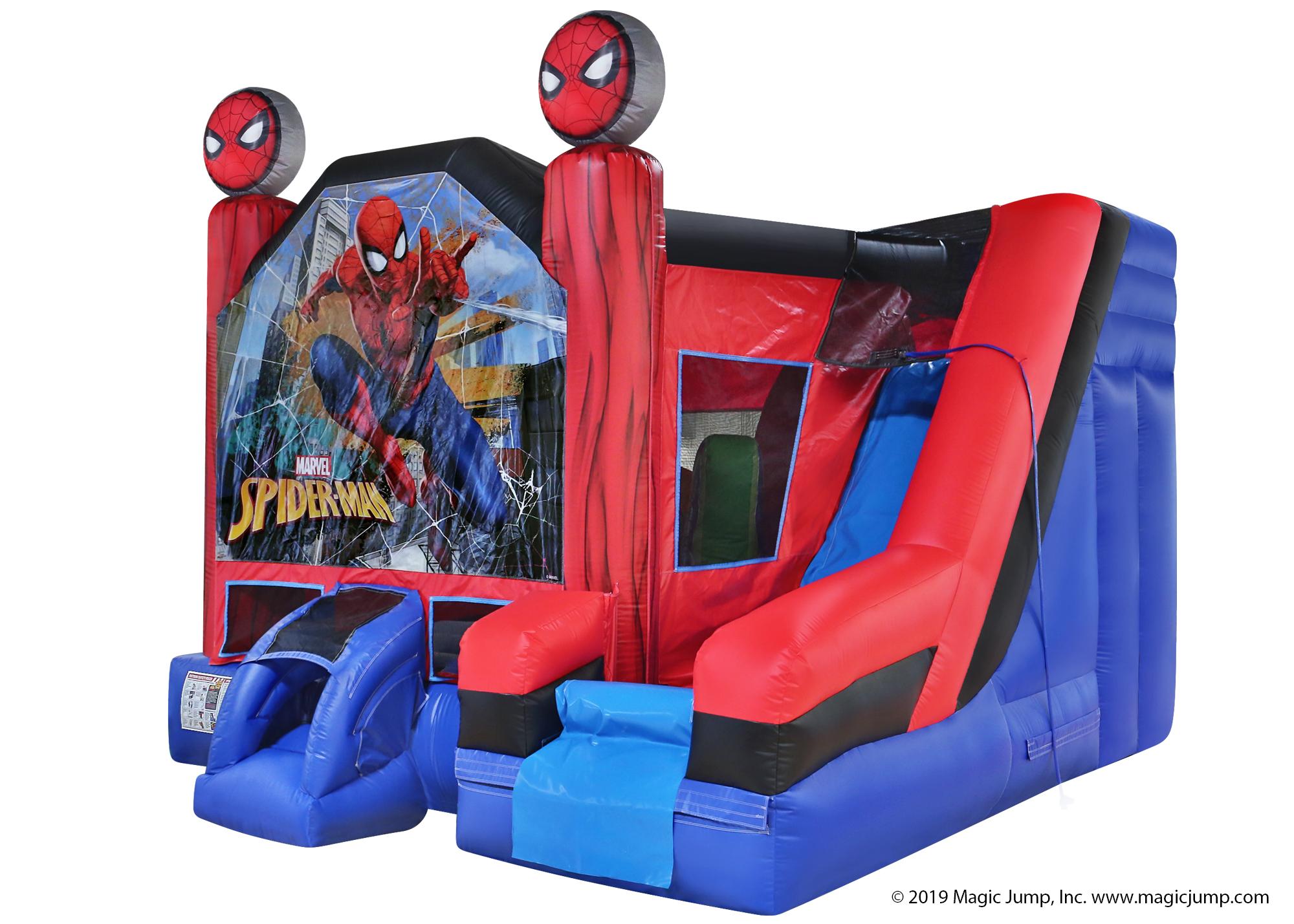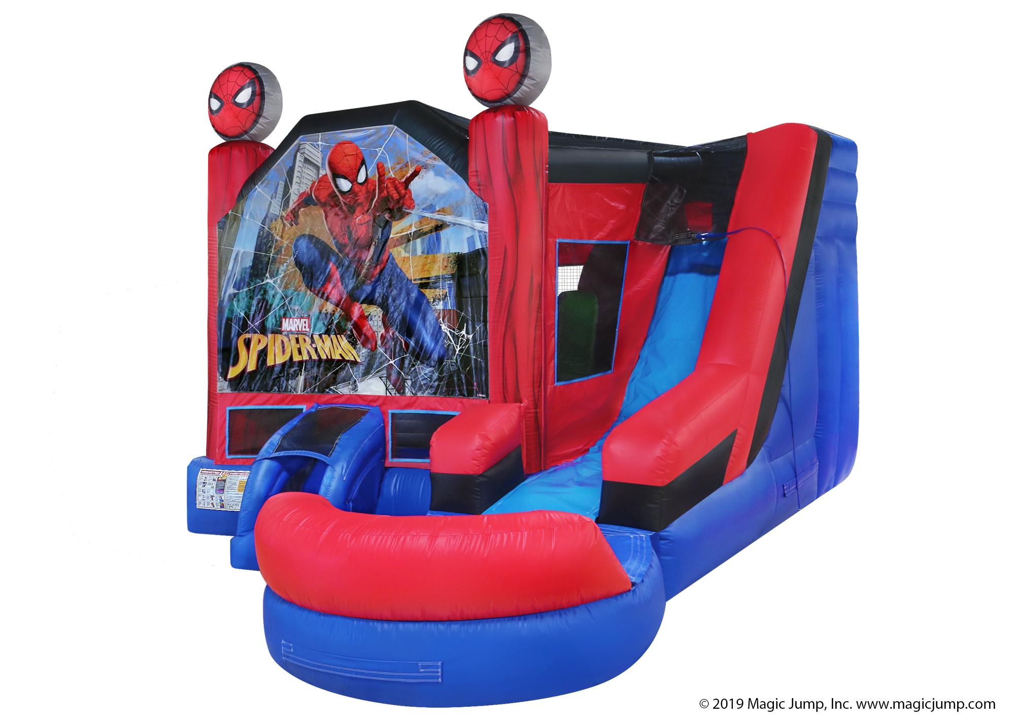 This Wet or Dry combo features six different inflatable activities: bouncing area, basketball hoop, inflated push-through, obstacle pop-ups, a wall climber, a wet or dry slide, and a removable pool/landing for wet use.