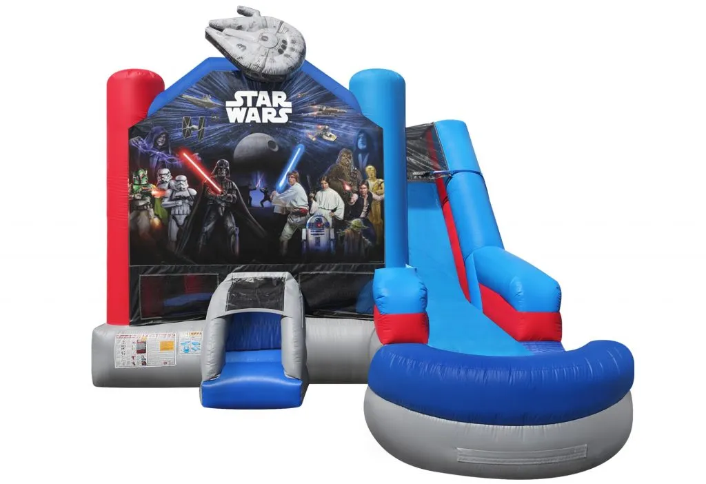 Coming from a galaxy far, far away, our STAR WARS 6 in 1 Wet or Dry Combo brings the interstellar adventure right to you. Enter a realm where bouncing fun commingles with the excitement of basketball hoops, inflated push-through challenges, and obstacle pop-ups, all leading to a climber that propels you to new heights. Whether you choose the wet or dry slide, you’re immersing yourself in a cosmic escapade